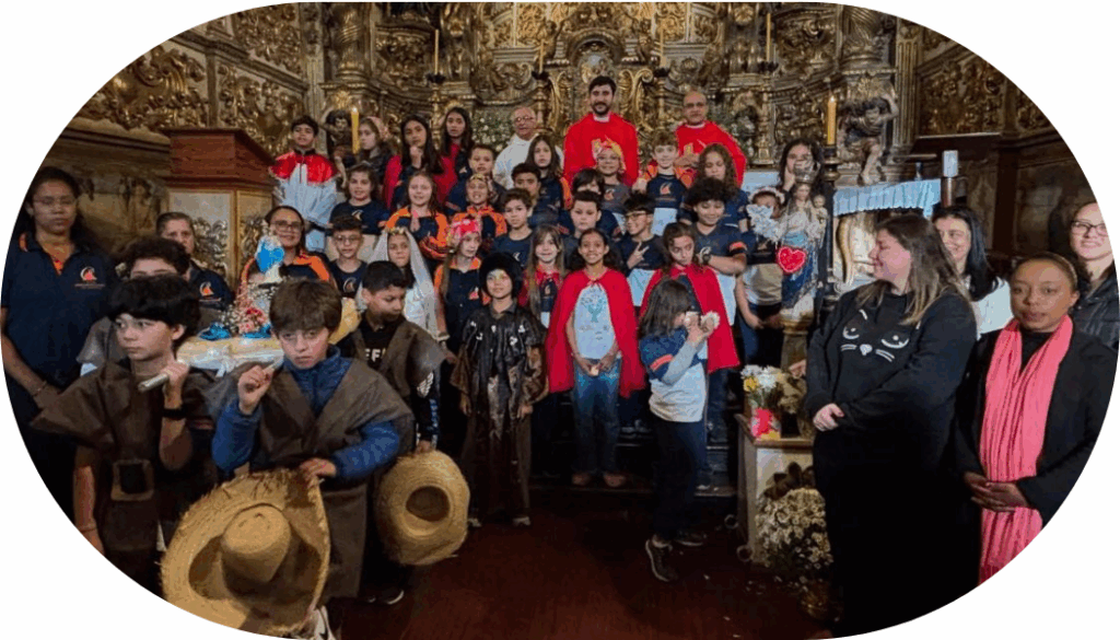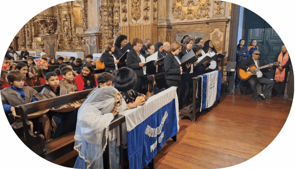 Em homenagem à Padroeira, a Assessora Pedagógica do CAOP Jacyra A. Meireles Rosa adaptou, com sensibilidade e zelo, a música da Coroação para que os(as) Alunos(as) do 5º Ano pudessem não apenas expressar sua fé e devoção por meio dos gestos e símbolos da Coroação, mas também cantar e narrar a história de Nossa Senhora do Pilar, unindo religiosidade e conhecimento histórico de forma viva e significativa.