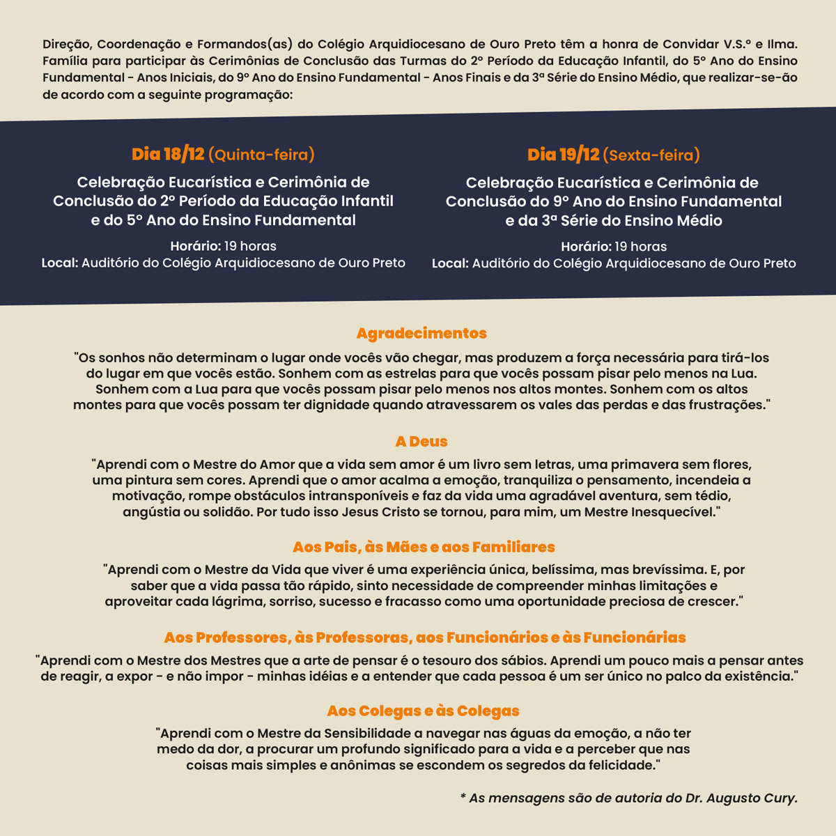 Direção, Coordenação e Formandos(as) do Colégio Arquidiocesano de Ouro Preto têm a honra de Convidar V.S.º e Ilma. Família para participar às Cerimônias de Conclusão das Turmas do 2º Período da Educação Infantil, do 5º Ano do Ensino Fundamental – Anos Iniciais, do 9º Ano do Ensino Fundamental – Anos Finais e da 3ª Série do Ensino Médio, que realizar-se-ão de acordo com a seguinte programação: